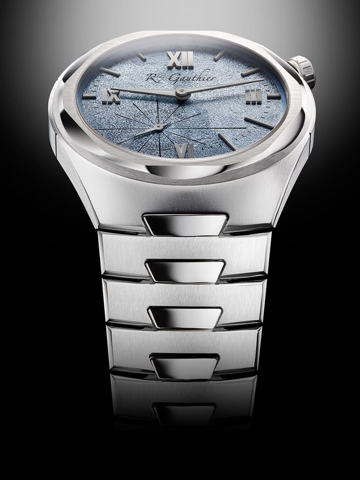 ▲PVD淺藍色白金面盤經過手工Bouchardé紋理裝飾後,形成細膩豐富的光澤層次效果,閱讀時間變得更賞心悅目。