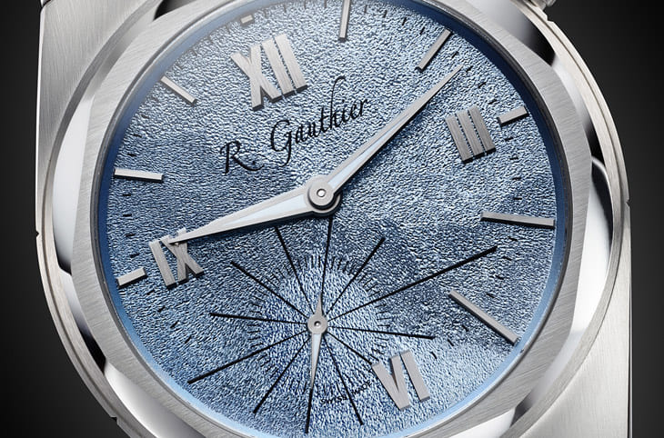 C by Romain Gauthier鉑金款以18K白金製作面盤,製錶師應用與機芯橋板相同的手工裝飾紋理(Bouchardé),製作過程以特殊鑿刻工具在金屬表面做出不規則凹凸感,再用PVD技術鍍上一層淺藍色,賦予面盤豐富的光澤層次感。細看手錶會發現它的時、分針並非處在面盤中央軸心,而面盤外圍的條狀時標不僅長度不一,每一枚還有略微收窄的設計,還有7點鐘方向的小秒盤,它的黑色刻度也是長短有別,尤其每5秒鐘的刻度長度特別長,原來ROMAIN GAUTHIER透過這樣的設計是為了打破傳統規矩的做法,讓面盤呈現一股輕盈靈巧的感受,也帶有視覺延續性,長期佩戴和手錶會愈看愈對眼。