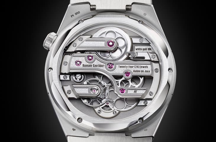 手錶搭載的是ROMAIN GAUTHIER精心創作的手上鍊機芯,在錶背有透明底蓋可以一窺機芯樣貌。機芯背面以直條形水平夾板貫穿,它們帶有「階梯」形狀,能營造高度立體感,甚至還會讓人看著看著以為夾板浮在輪系之上。與面盤一樣,機芯零件也講究地以白金製作,夾板表面和紅寶石均由直紋凸起的邊框勾勒、外緣也都採用雙倒角修飾,前面提過夾板和面盤都以特殊鑿刻工具製造出類似霜金飾紋的不規則紋理,而再往機芯內部望去的機芯主板則也有磨砂處理。通常獨立製錶品牌製作機芯工都非常細,這點反映在這款錶機芯的齒輪和棘輪再度證明,零件邊緣不僅以手工打磨出弧形,還會加上珍珠紋圓點裝飾,另外發條盒飾有蝸型紋、蝸型齒輪和S形螺絲也都經過高度手工拋光,所有細節都一絲不苟,賞玩機芯時令人大呼過癮。