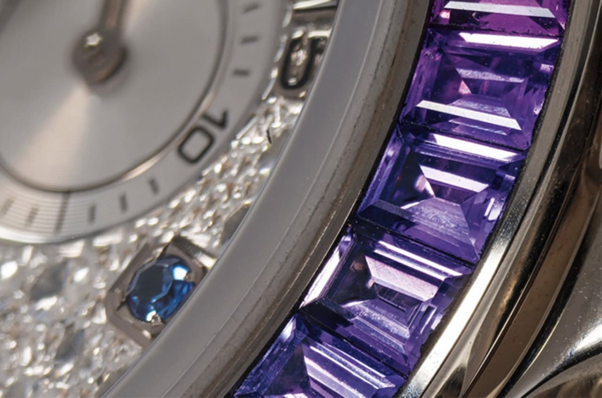 這款創紀錄的Cosmograph Daytona "Rainbow" 16599白金款為1994年生產,當時勞力士是以一次性發行策略推出,手錶的亮點在於錶圈鑲有深紅色到紫色的漸變色藍寶石、面盤則鑲滿鑽石以及藍寶石時標,搭載的是以真力時El Primero為藍本的4030自動機芯,説得直白點就是2010年代Daytona彩虹圈的始祖(早推出約20年),劃時代的設計以及代表性不言而喻。