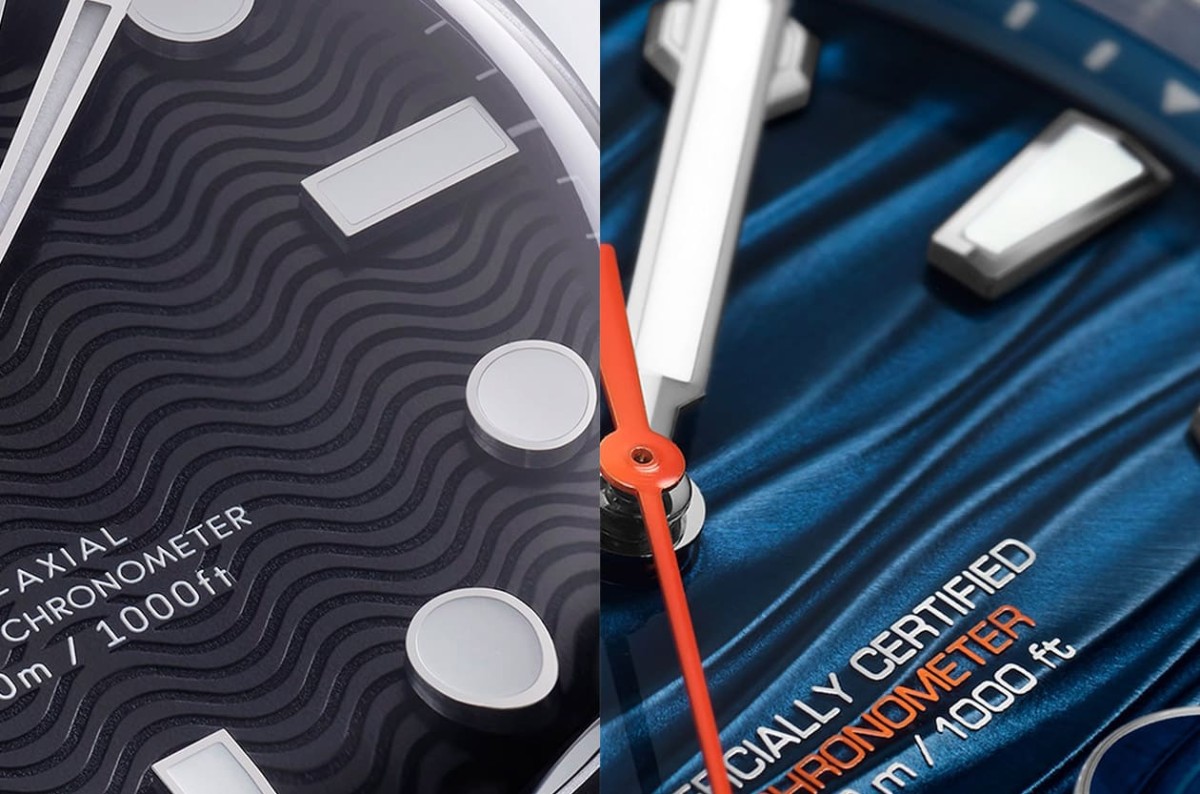 面盤顏色和錶殼線條是營造一只錶外觀的決定性因素,此外也別忽略有些手錶面盤上的紋理也很重要,甚至它的重要性有時也不亞於前面提到的兩個因素,因為手錶的面盤紋路如果設計得好、有特色,那就能讓讀時更清楚、也更賞心悅目。例如我們在強調防水性能或與海洋文化有關的作品上,常會注意到錶廠採用象徵大海的波浪紋理,這種裝飾和日內瓦波紋、巴黎釘紋那種看起來工整又勻稱的設計不盡相同,波浪紋為了展現滔滔海浪般的臨場感,通常紋理也更為奔放無拘,帶有一種野性的美,放在休閒運動風格的錶上簡直是天生絕配。
