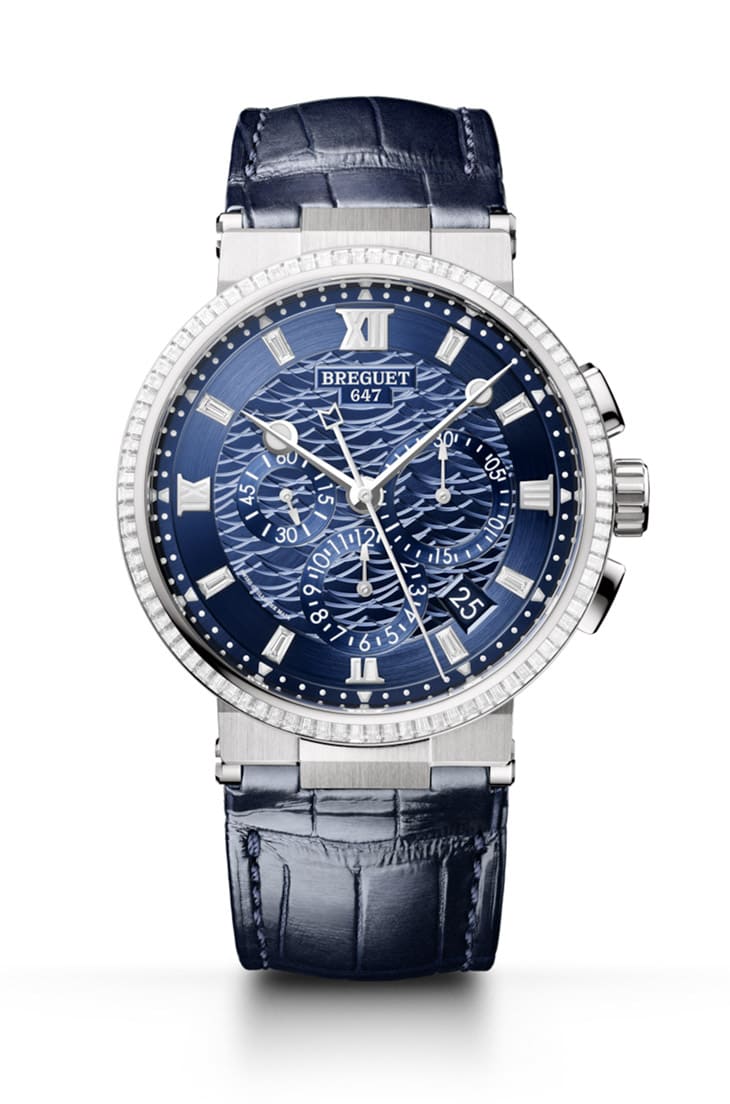 Marine系列的計時碼錶導入了鑽石鑲嵌這項元素,搭配貴金屬錶殼呈現出更為華麗的氣息。通常採用貴金屬材質的Marine手錶,面盤都會刻上與系列創作淵源相關的波浪紋,展現更為講究也更精緻的系列高階款式氣場。Marine 5529計時碼錶的錶圈鑲有90顆長方形切割鑽石,而也因為多了計時功能,因此錶冠兩側沒有另設護肩,將空間騰出給計時按把。手錶面盤的3、6、9、12點方向鑲有立體金質羅馬數字時標,其他8個方位則是鑲上8顆長方形切割鑽石替代,剛好手錶將日期顯示設在4~5點方向之間,因此它的時標並沒有減少,判讀時也更清楚好認。錶款內部搭載582 QA自動機芯,它的零件數達到346枚,機芯內部也有矽游絲、矽馬仔等槓桿式擒縱系統,鏤空自動盤刻意作成船舵造型,這點和面盤的波浪紋有異曲同工之感,都暗示著系列因為大海而生的背景。