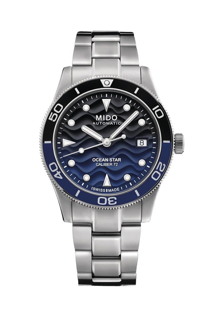 海洋之星是入門潛水錶中的人氣款式,2024年系列迎來問世80週年紀念,也因此美度推出了改款打造更吸引人的產品內涵。手錶這次將錶徑下修至39mm——明顯是衝著現今市場更偏好適中尺寸的趨勢而來,同時手錶厚度10.5mm以潛水錶來說也算薄型設計了,由此可見Ocean Star 39在保有潛水錶的特徵之餘,提升佩戴舒適度是美度這次改款的重點。外型部分,Ocean Star 39的單向旋轉錶圈呈現出藍、黑雙色,一般潛水錶的錶圈比較少看到這種設計,同樣的邏輯也延續至面盤的波浪紋浮雕圖案,其與錶圈的雙色呼應,上半部為色、下半部則過渡轉化為藍色,浪浪紋設計粗勇豪邁,配上雙色很容易就替手錶樹立鮮明個性。Ocean Star 39換上MIDO全新打造的機芯Calibre 72,雖然也是改制自ETA的機芯作品,但至少品質穩定性令人安心,機芯與Calibre 80的規格相去不遠,動力儲存雖下降至72小時,但是厚度也隨之下降,是手錶能夠變薄的箇中關鍵。