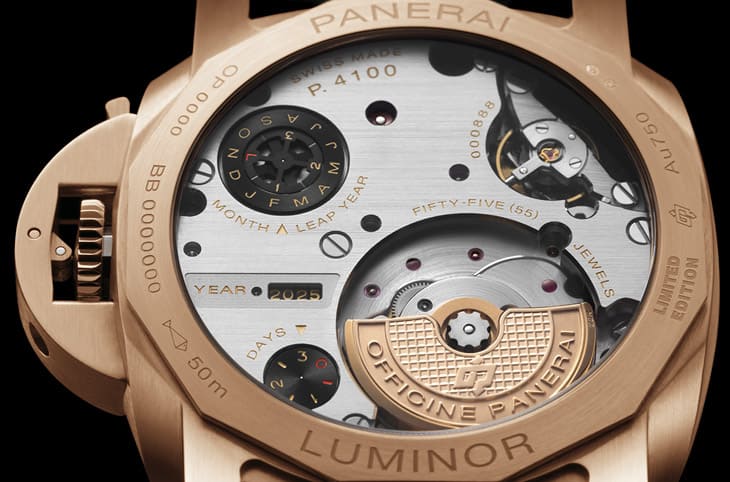 手錶的錶背還是有透明底蓋秀出P.4100自動機芯,這枚機芯的特點之一在於它並未將所有顯時資訊都呈現在面盤側,反而在背面的底板上還有閏年、年份以及動力儲存顯示等平常使用頻率沒那麼高的資訊,讓佩戴者在需要時翻面就能判讀,平時則可以保留面盤整體的俐落感,設計透露出沛納海的細心考量。