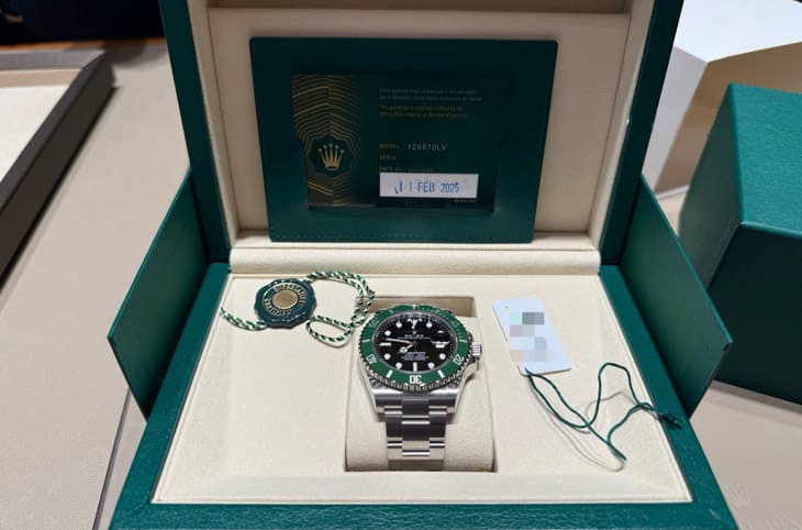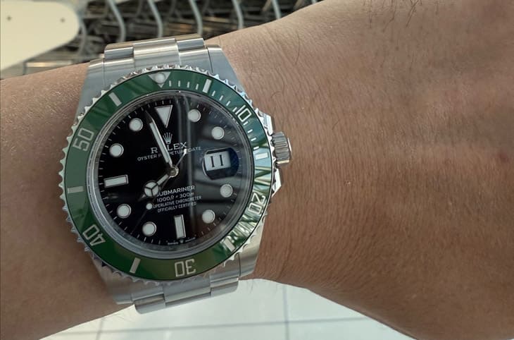 當然原Po買了一只綠水鬼已經心滿意足,沒有再繼續失心瘋買其他勞力士,只是他買完後還是覺得超級不可思議,在2025年的現在路過勞力士專賣店隨便一問,竟然讓他買到低於定價的綠水鬼,他開心到當場拍照記錄這個神奇時刻,直接在機場開箱戴上自己的新戰利品。