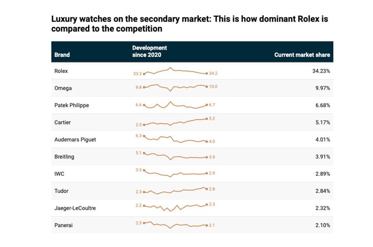 ▲Chrono24觀察人氣手錶品牌過去5年內市佔率變化,勞力士雖曾一度爆衝,但如今又回到接近2020年的水準。Source:Chrono24