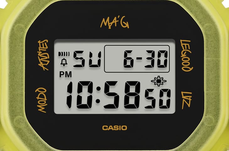 ▲錶款採用螢光黃色樹脂錶殼、錶帶,搭配液晶螢幕周圍的黑色示人,上頭的模式指示器字樣還是J Balvin親筆寫下的西班牙語,這也是G-SHOCK首度嘗試融合這種語言的作品。
