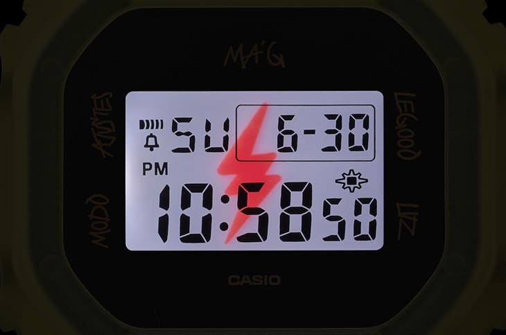 DWE-5600JB外觀以半透明的螢光黃色樹脂製成,內含碳材質組成耐衝擊的碳核心防護構造,手錶面盤周圍以黑色為主,並點綴J Balvin親筆寫下的西班牙語模式指示器字樣,其中也包含12點向的Ma G字樣,這也成為G-SHOCK第一款以西班牙文字呈現的作品,突顯聯名主角的出身背景文化以及他的個人風格。至於手錶的液晶螢幕則是傳統的白底黑字,在光線正常的情況下看起來跟一般G-SHOCK差不多,但是如果開啟LED背光功能時,螢幕中便會浮現一個J Balvin代表性的紅色閃電標誌,強化手錶的特殊主題風格。