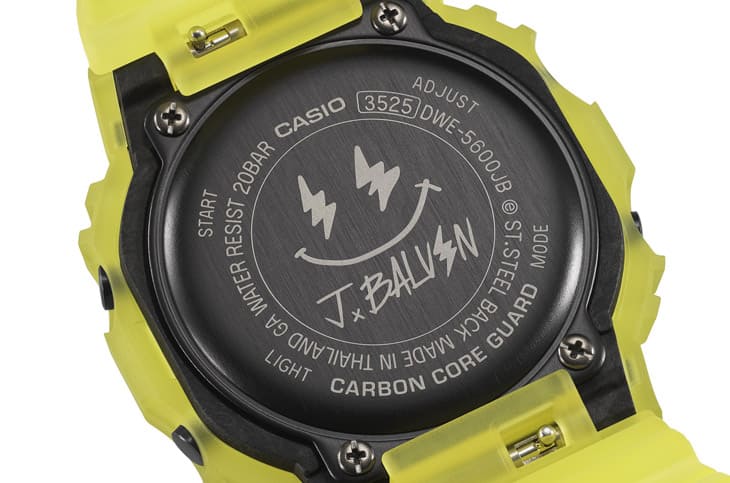 ▲DWE-5600JB底蓋也刻有J Balvin的Logo與閃電眼的笑臉圖案,傳達音樂家想要帶給大眾的正能量。
