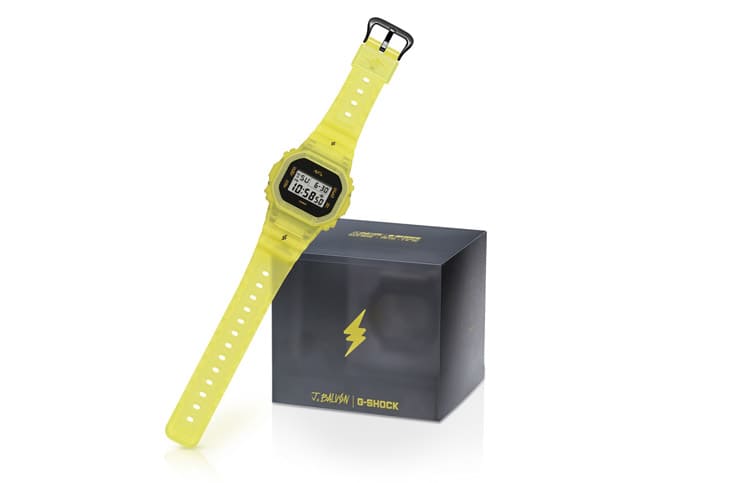 DWE-5600JB除了半透明霧面螢光黃色錶殼與錶帶之外,G-SHOCK還會附上黑色的可替換錶圈與錶帶,而錶帶與底蓋上也和背光燈一樣,都有加入J Balvin代表性的閃電符號標誌,底蓋本身也有鍍上黑色,因此在換上錶殼與錶帶零件後,手錶會呈現出G-SHOCK手錶經典的全黑風格,這與換上螢光黃零件時的對比色組合又是另一種不同的感覺。