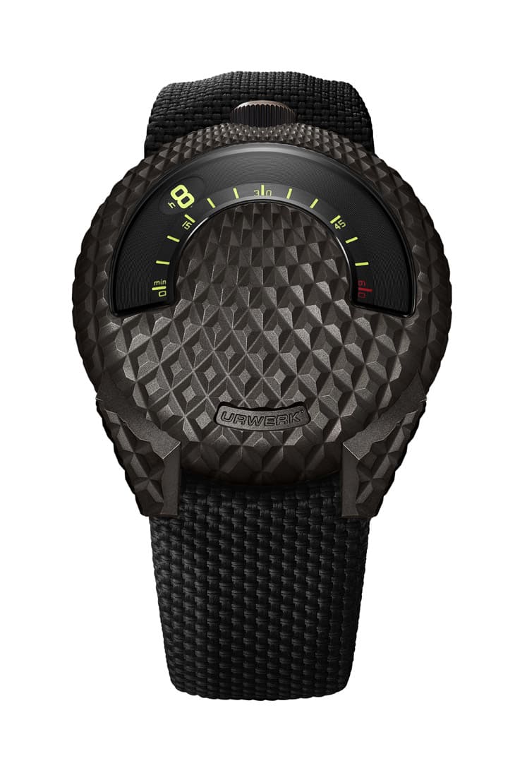 UR-101 T-Rex的奇特錶殼稍微有點轉移它同樣很特殊的顯時系統的光芒,其正面的180度弧形視窗露出衛星小時轉頭和一個蝸形卡羅素裝置,當小時轉頭隨著時間前進的同時,它便能夠配合下方的刻度同時指示分鐘,別出心裁的設計閱讀時直覺易懂,即使不是採用傳統指針設計,還是維持了清楚的顯時作用。