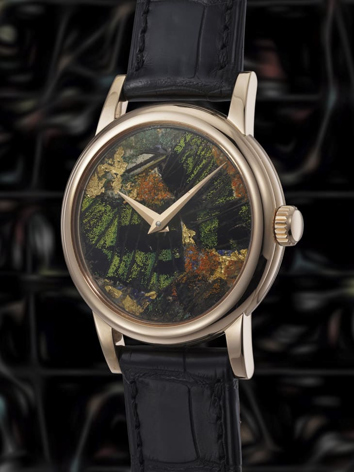 獨一無二的Simplicity手錶首度融入了罕見裝飾工藝,其面盤由藝術家Dominique Arpa-Cirpka以真正的蝴蝶翅膀製成。手錶採用37mm玫瑰金錶殼,搭載完全以手工精修而成的機芯。