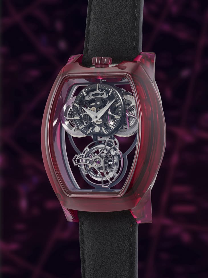 採用醒目的紅寶石錶殼,搭載鏤空機芯展現微型建築般的迷人結構,尺寸高達18mm的陀飛輪及在紫外光下呈現的螢光效果,展現了ARTYA為人稱道的大膽創意。