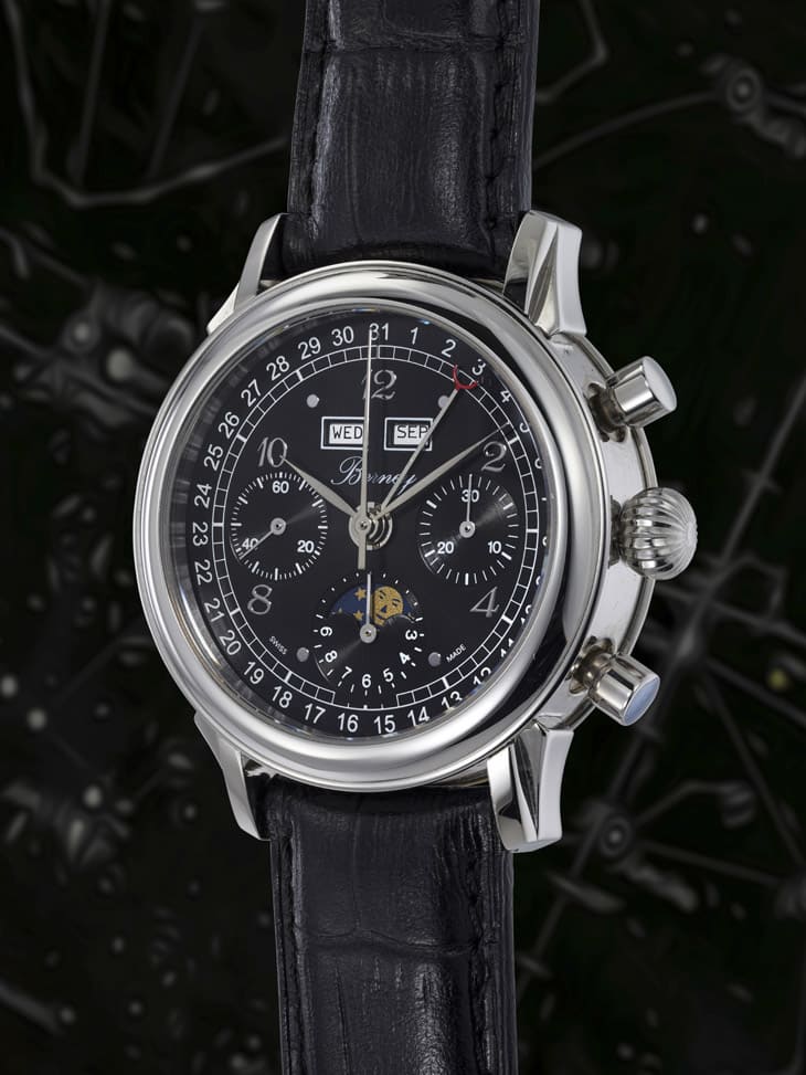 手錶採用39mm不鏽鋼錶殼、搭配黑色面盤和優雅的寶璣數字時標,內部搭載Valjoux 88手上鍊機芯,具有全日曆和月相等複雜功能組合。
