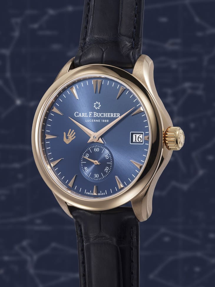 獨一無二的馬利龍外緣動力手錶,40.6mm錶殼為玫瑰金材質,深藍色太陽紋面盤9點方向飾有Philippe and Elisabeth Dufour Foundation的標誌,同時其搭載蘊含寶齊萊招牌工藝特色——環形自動盤的A2050機芯,並通過瑞士天文台認證。