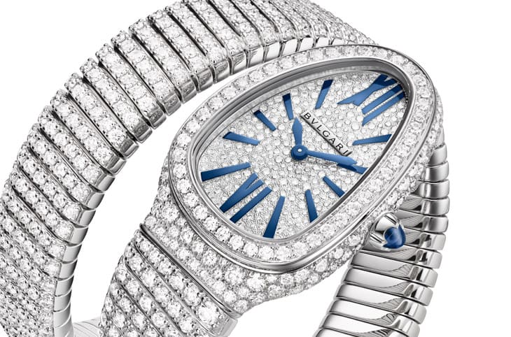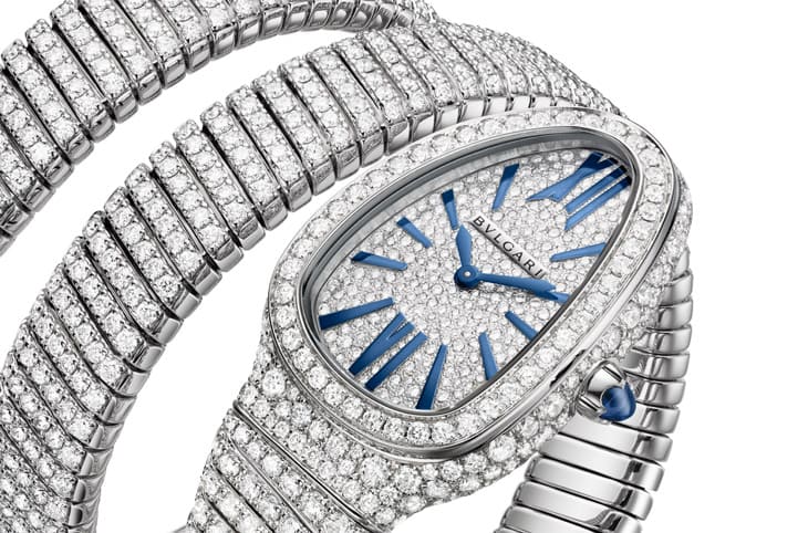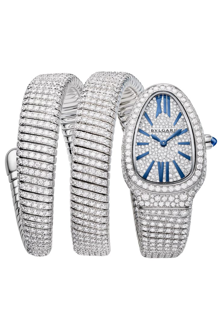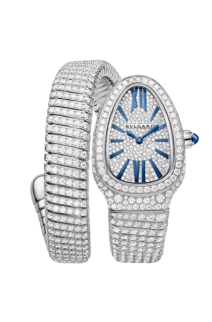 錶款分為單圈與雙圈兩種設計,從日常華麗到極致奢華皆有所選擇。單圈版本例如白K金款,鑲嵌超過900顆明亮切割鑽石,鋪滿錶殼、錶圈與鍊帶,搭配藍寶石錶冠與藍色指針,呈現出一種冷調高貴的優雅風格;而雙圈版本則進一步將蛇形包覆感發揮到極致,不論是多金屬交疊的三金版本,還是密鑲逾千顆鑽石、總重超過20克拉的白K金款,皆讓人一眼驚豔,難以忽視。