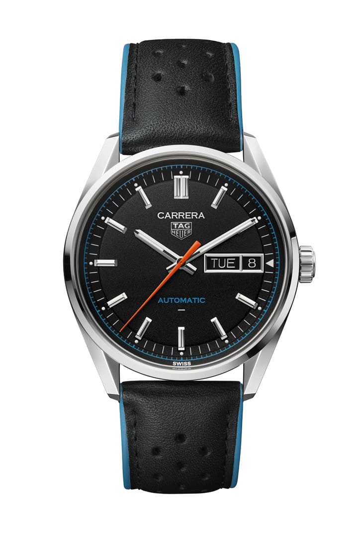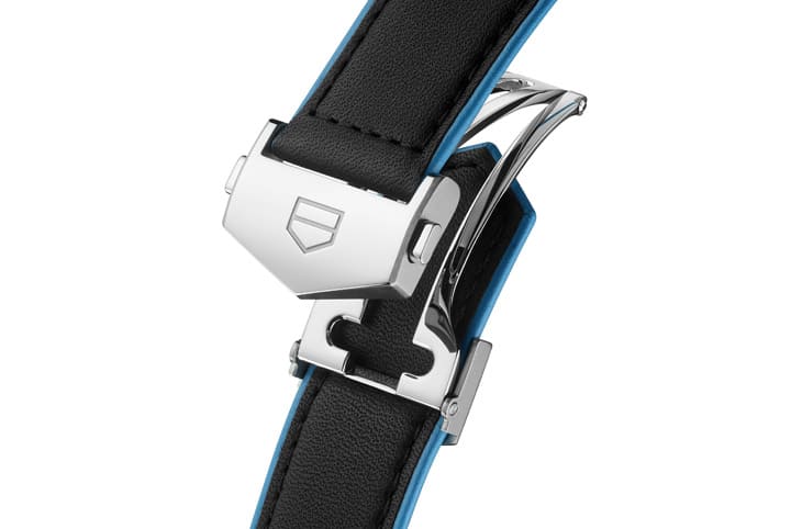 這款型號配置的皮革錶帶不容忽視,它屬於黑色穿孔小牛皮,靈感直接來自賽車手套與座椅皮革,不只強化了這款錶的運動血統,也帶來柔軟貼手的佩戴體驗,吸引人的視覺亮點藏在錶帶內側與邊緣那一抹突出的淺藍色襯裡,悄悄露出一條對比色線條,低調卻吸睛,還巧妙呼應面盤上“Automatic”字樣的藍色字體,而且全系列不管皮帶或金屬鍊帶版本皆擁有快拆系統,讓佩戴者可輕鬆自行替換錶帶,這樣的改良,代表泰格豪雅在佩戴便利性上的持續進化,不僅實用,也提升了品牌競爭力,雖然皮帶的錶扣本身尚未支援微調功能,但整體錶帶設計與工藝細節已經表現出優異水準,讓人感受到這款手錶不只好看,更是「日常好用」。