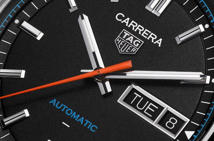 Carrera Day-Date新作中的黑面版本可說是經典賽道美學在日用手錶上的進化版。首先,黑色粒紋面盤與同材質外緣巧妙營造出低調又層次分明的視覺效果,看起來更專業,也讓整體更耐看,搭配鍍銠拋光的棒狀時標與指針,外加Super-LumiNova®夜光塗層,即使在昏暗環境中讀時也毫不費力,紅色中央秒針的設計也特別加分,時時提醒這款錶的賽車靈魂。星期與日期顯示位於三點鐘方向,除了實用性,還帶有邊框設計,細節感瞬間提升。而在刻度環設計上也有更新,從過往單一軌道升級為雙軌式設計,更添閱讀清晰度。特別值得一提的是,這次的日期盤採用與面盤呼應的黑色基調,讓整體設計更統一、和諧,加上更纖薄的錶圈與加大藍寶石鏡面,視覺穿透力大幅提升,讀時舒適度也升級不少。