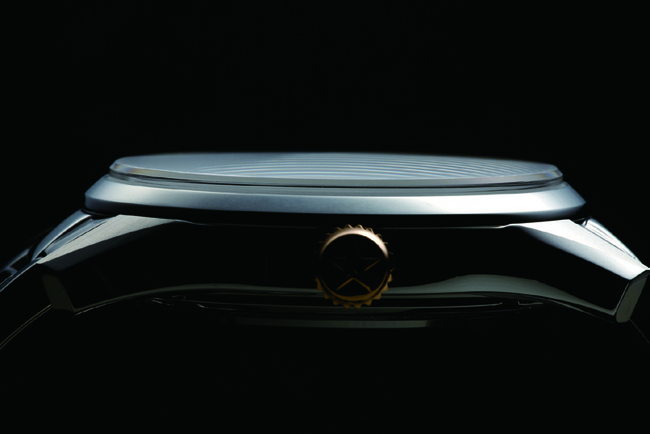 錶款的錶鏡突出於錶圈,邊緣有作倒角,廣義來說仍然算是Box式的錶鏡,同樣屬於復古的元素。錶款金色的使用僅只於點綴,嚴格來說不算是半金,不過底蓋上那一枚金幣還是滿大的。
