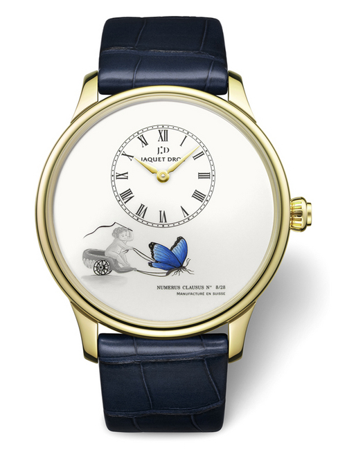 愛之蝴蝶手錶(The Loving Butterfly)不僅是穿越時空的旅行,還表達出品牌創始人富有遠見的價值理念:科學的精準,探索的精神,對自然的激情,而這些,都由色彩豐富明晰的大明火琺琅絲絲入扣地呈現出來。愛之蝴蝶手錶是品牌首枚黃金錶殼手錶,它致敬品牌誕生275週年的同時,也寓意愛之珍貴。錶背標注限量28枚的獨立編號,還可欣賞到白金擺陀優美運作及錶背的手工鐫刻字樣,其細膩與精美均歷歷在目。這兩處標誌性細節,由雅克德羅藝術工坊Ateliers d'Art打造,它不僅延續雅克德羅傳奇,還將每一秒的時間流逝都演變成夢境。