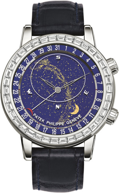 滿天星斗面盤中,以橢圓形弧線框示了日內瓦可見的夜空範圍,搭配蒼穹圖、月相及月球軌跡、天狼星及月球中天時間顯示。極具多工指示功能的6104G手錶,指針式的日期顯示,加上時針及分針顯示平均太陽時間,看似繁複卻錯綜有序。再以手工鱷魚皮錶帶,搭配22顆長形鑽石鑲嵌折疊式錶扣(約1.13克拉),整只手錶對比色澤,更能體現錶面設計之美。