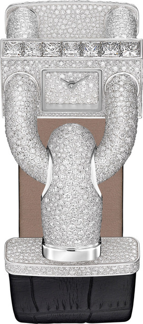 ▲ Cadenas Pavée 全鋪鑲鑽石手錶,白K金、鑽石搭配短吻鱷魚皮錶帶,搭載石英機芯,華貴雍容。