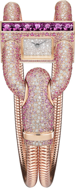 ▲ Cadenas Pavée Saphirs Roses Bracelet 金質錶鍊配全鋪鑲粉紅剛玉手錶,玫瑰金、鑽石、粉紅剛玉搭載石英機芯,瑰麗奪目。