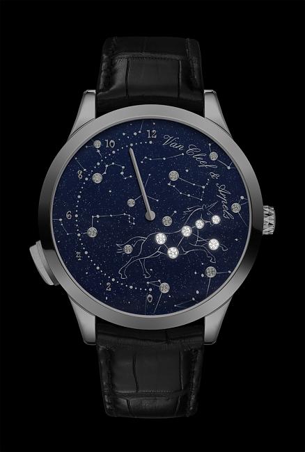 為了重塑逼真的星空效果,錶款面盤特別選用砂金石玻璃為底盤,並綴上美鑽星海。純白微型彩繪在星塵間描畫出星宿的線條,麒麟座(又名獨角獸座)在面盤上清晰可見,幽幽呼應VAN CLEEF & ARPELS梵克雅寶的醉人夢幻世界。額上長有尖角的獨角獸是神祕珍獸,自1970年代至今一直是品牌的想像力泉源。面盤上的獨角獸輪廓由六顆美鑽勾勒,鑽光如魔法般點亮星空,脫俗出塵。