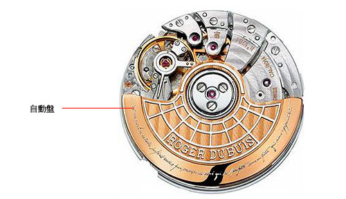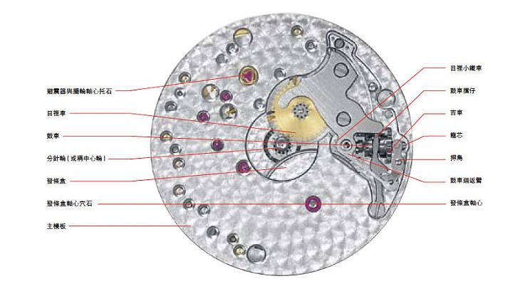 我們以RD98 手上鍊機芯來解說,主要原因是結構明瞭清楚,但是現在市面上以自動上鍊機芯為主要機種。它是藉由手腕擺動,重力牽引自動盤旋轉,達成上鍊的功效。清楚而明顯的自動盤,佔機芯二分之一的面積,是區分手上鍊機芯與自動上鍊機芯,最快速的方法。