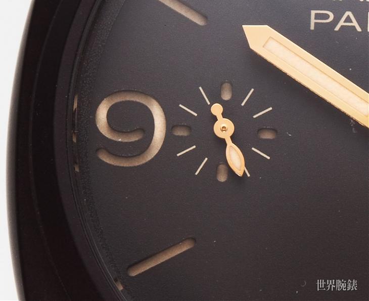 ▲沛納海經典的棒狀時、分指針,在Radiomir系列不曾直接加上九點鐘時標與小秒針的配置,雖然在Radiomir 1940系列相當常見,但在PAM00504看見這兩者的搭配,是品牌目前唯一一款如此配置的Radiomir系列錶款。