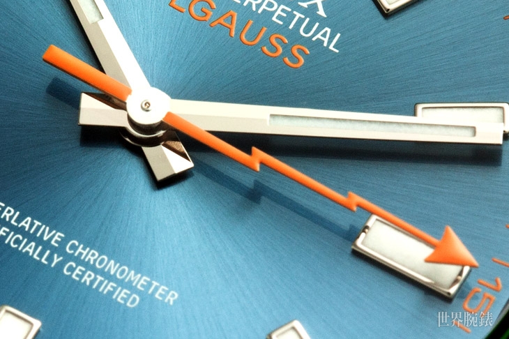 ▲Milgauss將標誌性的閃電指針大膽換上了橙色,與鏡面側緣的綠,打造出很時尚的調性,難怪會有人說是衝著這個指針而入手Milgauss。