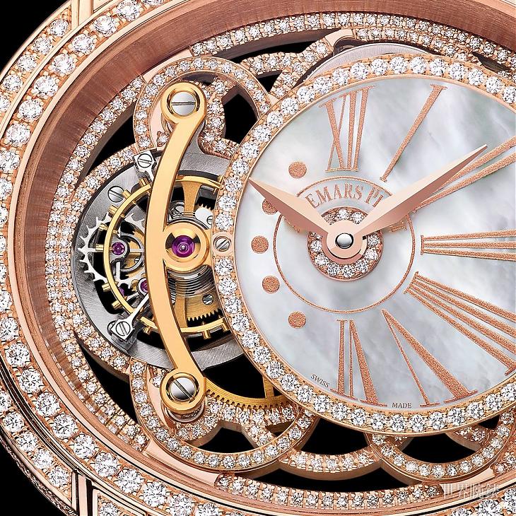 ▲面盤上鑲嵌美鑽,將這只錶襯托的更加華麗,透過鏤空面盤也能看見陀飛輪機芯