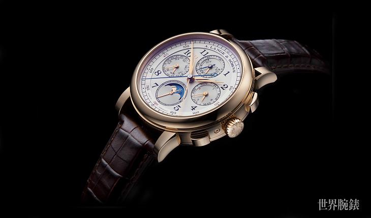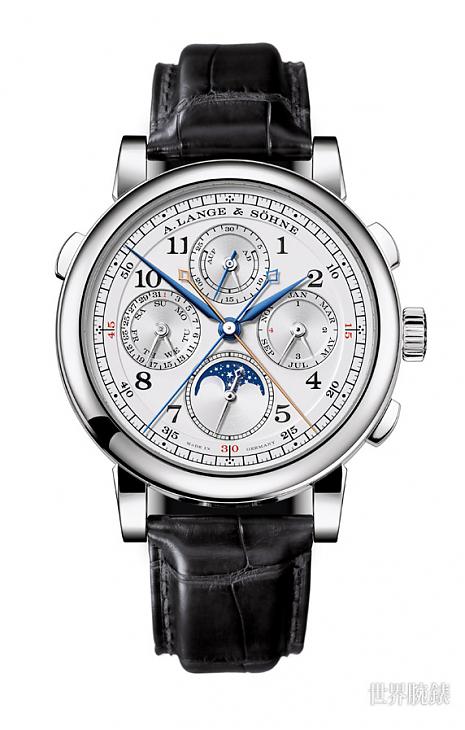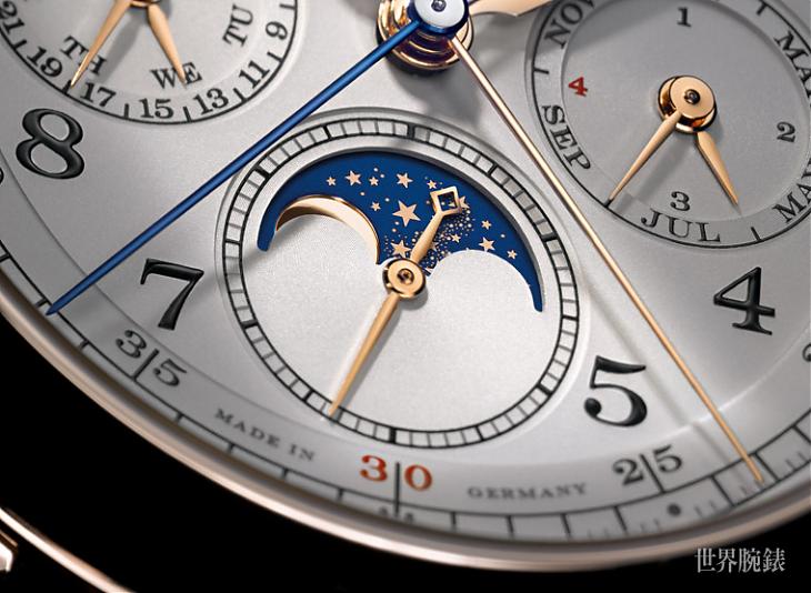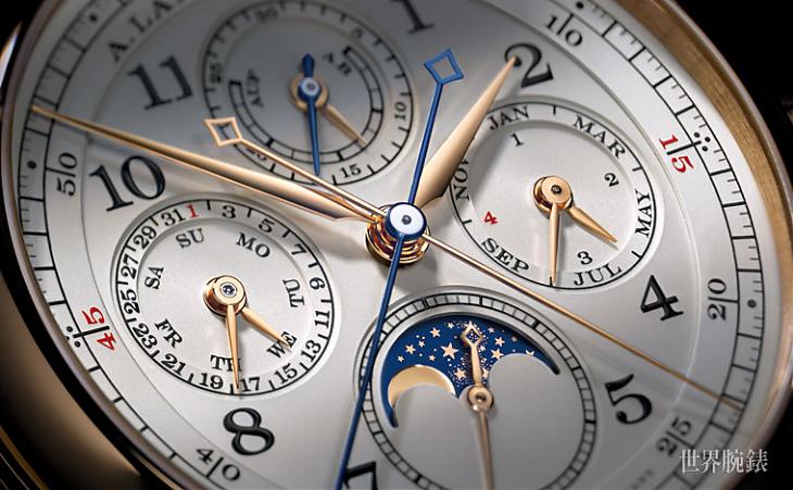 ▲錶款面盤走的是傳統勻稱的複數小錶盤格局,朗格善用了同軸指針將萬年曆與計時功能有效整合,此外為了區別計時與走時功能,兩枚大小計時指針特別採用藍鋼處理,讓人更清楚不同功能所屬。