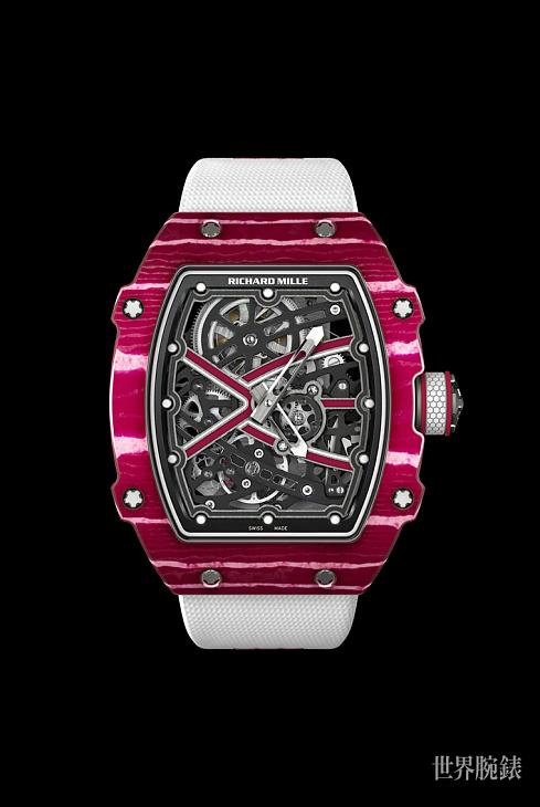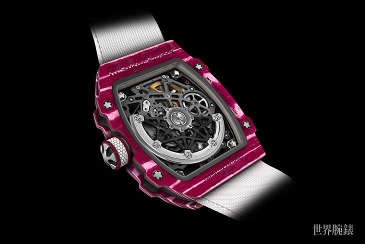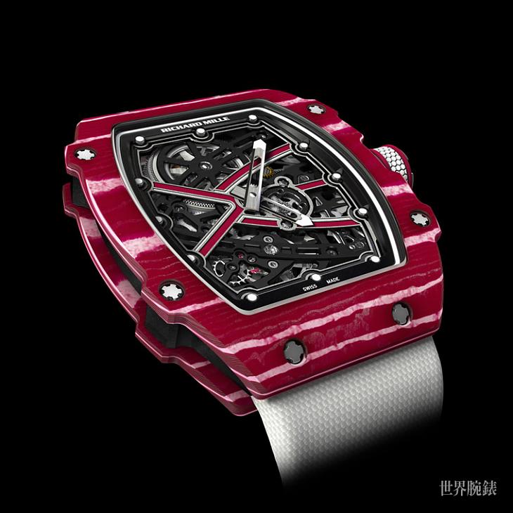 ▲RM67-02 High Jump款腕錶使用深紅色樹脂,錶殼TPT®碳纖維和TPT®石英複合材料具有輕便、纖薄和人的特性,完美符合運動腕錶的要求。