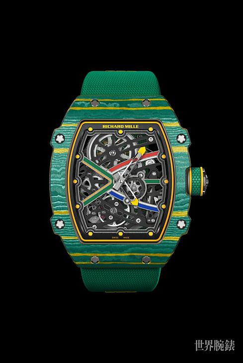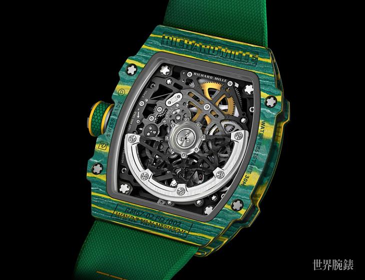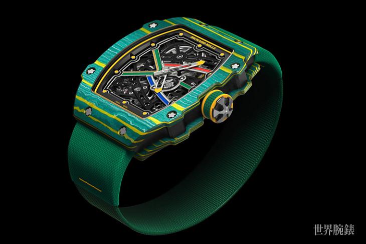 錶殼由RICHARD MILLE獨有的TPT®碳纖維和TPT®石英複合材料打造而成,TPT®石英的奧祕在於:由最大直徑僅45微米的矽薄層疊加製作而成。通過專用機器裝配,調整纖維方向,讓每一層呈45°角交錯,隨後浸入新研發的三種彩色樹脂:Mutaz是卡達人,與他合作的RM67-02 High Jump款腕錶使用深紅色樹脂,而RM67-02 Sprint使用的兩種顏色——黃色和綠色則代表了Wayde的國家,南非。TPT®碳纖維製成的錶環使用了相同的工藝,但所用的材料為碳纖維。