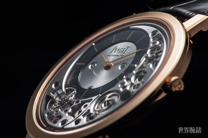 在Altiplano Ultimate Automatic機芯和錶殼融為一體的結構中,由後者充當主夾板的角色,內部裝嵌219枚纖薄零件,部分零件與頭髮厚度不相伯仲,甚至某些齒輪的厚度僅0.12毫米,遠低於傳統機芯齒輪0.20毫米的規格;並以極盡複雜的設計把機芯結構倒轉,錶橋裝嵌在面盤正前方,透過鏡面便將優美結構一覽無遺,造就Altiplano Ultimate Automatic獨有的美感;而偏心時、分的顯示方式,則與Altiplano系列的設計風格不謀而合。同時,為了打造纖薄質感,所有機械裝置和手工裝嵌零件均嚴格限制厚度,確保不會較平衡擺輪厚。新錶款以面盤上裝嵌單一錶橋支撐的懸浮式發條盒,取代一般裝嵌在主夾板上的發條盒,提供50小時的動力儲存。以22K金質鑄造的環形自動盤同樣設於機芯外圍,除了為其賦予足夠的重量、確保走時的穩定性,更與機芯厚度融為一體,達成整體的纖薄效果。