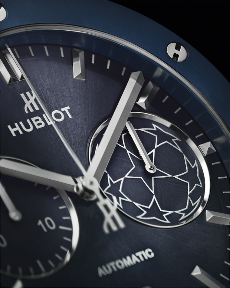 Classic Fusion Chronograph UEFA Champions League只具備一般的計時功能(而非宇舶旗下作品中為了足球運動專門設置的計時功能),設計佈局也與一般的Classic Fusion計時碼錶相同,包括面盤3點及9點位置設有小秒盤及30分鐘計時盤,6點位置則是日期窗,立體棒狀小時刻度配劍形指針。