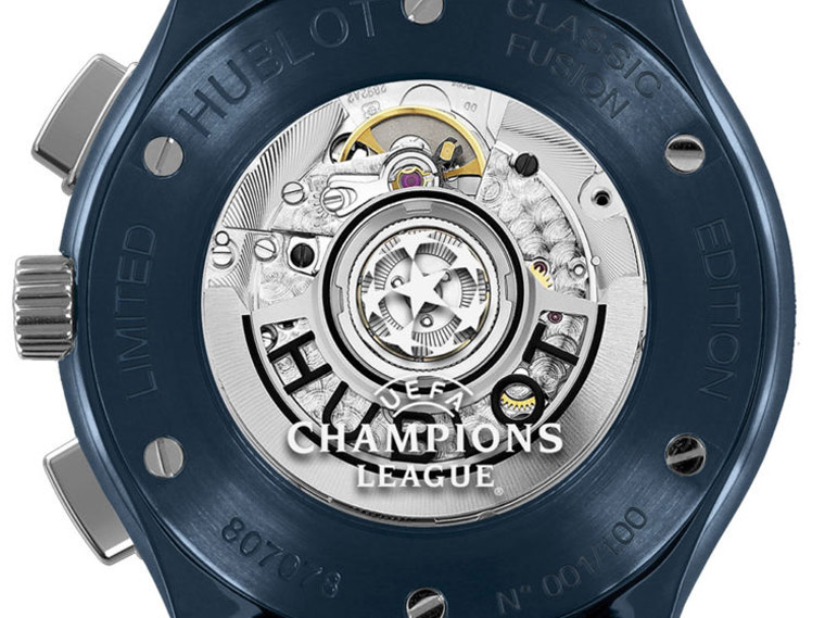 ▲透明底蓋除了可以一窺HUB1143機芯的面目,底蓋上也同樣刻印了歐冠盃的標誌,另外底蓋邊緣也加上了限量編號,突顯紀念價值。