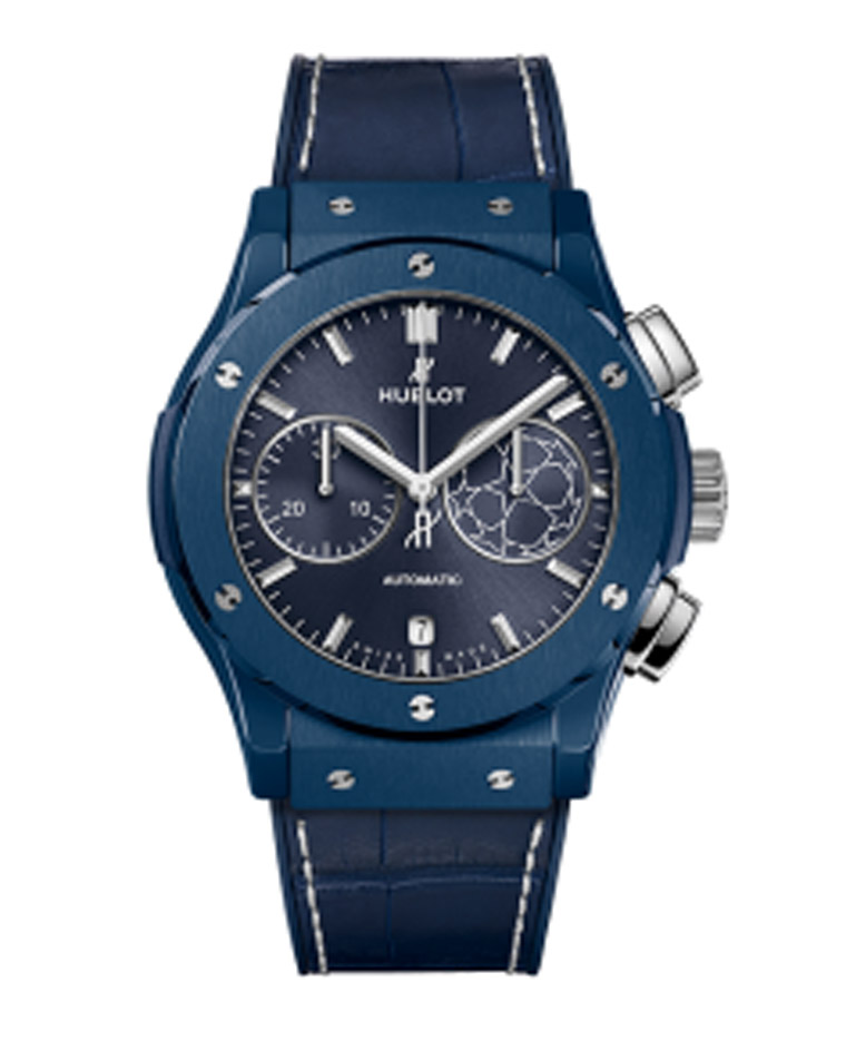 藍色陶瓷材質/HUB1143自動上鍊機芯/時、分、小秒、日期顯示/計時碼錶功能/藍寶石水晶鏡面、透明底蓋/防水50米/錶徑45mm/限量100只