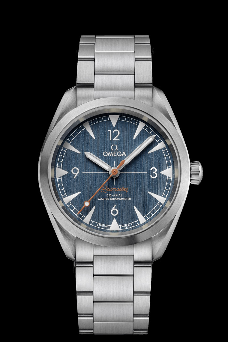 全新磨砂面盤令人驚豔,而其凹槽時標全都填入復古(舊鐳色)Super-LumiNova超螢光塗料。面盤搭載鐵軌式分鐘刻度環、歐米茄「十字瞄準線」復古精準標誌,以及展現古典風情的米色轉印”Railmaster”鐵霸錶英文字樣。最後,棒形時針與分針搭配著與鐵路有著緊密關聯的熱門「棒棒糖」中央秒針。