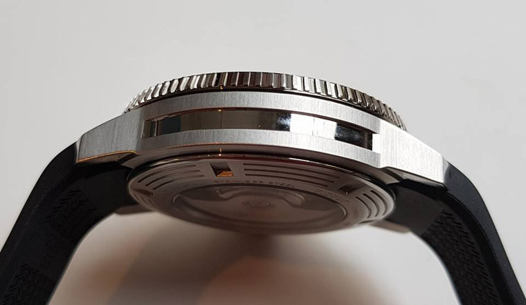 ▲錶殼左側的磨砂與亮面相間,業界首創。