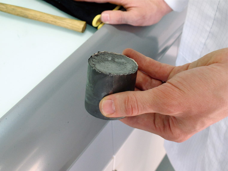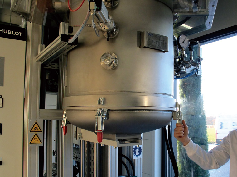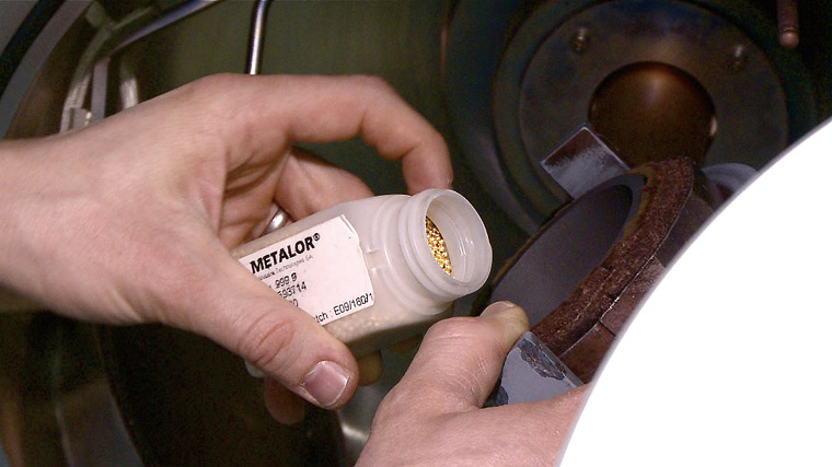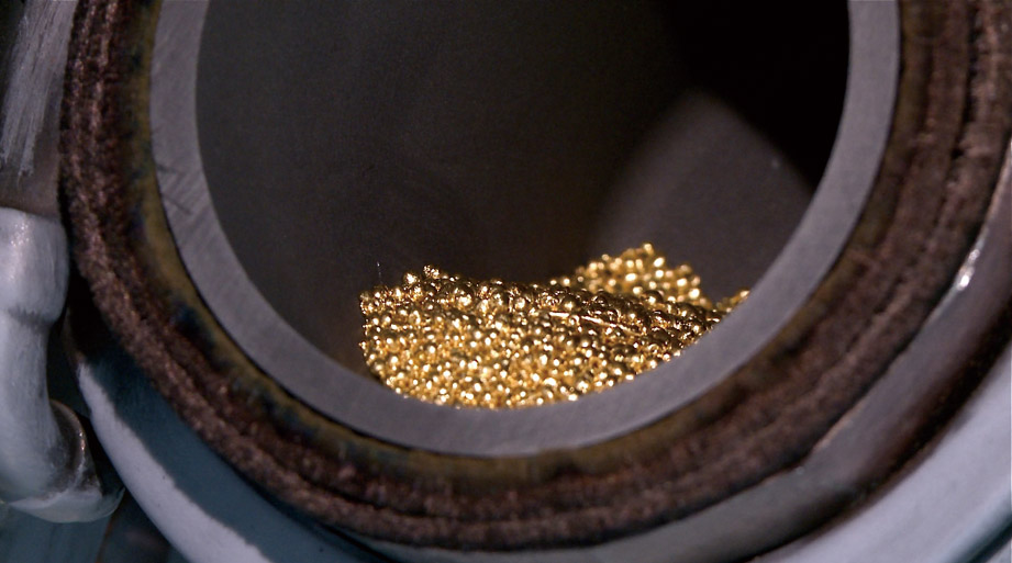 陶瓷坯體完成後,下一步驟是讓陶瓷殼和黃金融合在一起。圖中的實驗人員正把24K黃金粒倒進儀器的金屬熔具裡,以高熱讓黃金成為液態後,會在1700度的高溫和2000帕斯卡(Pascal)的高壓條件下注入陶瓷粗坯,並確保熔融後的液態黃金能夠完全填滿陶瓷的毛孔。至此新的合金誕生,並和其他18K合金一樣,擁有750/1000的純金,但又因其中的陶瓷成份而得以擁有其他K金不能比擬的防刮特性。也由於Magic Gold是以追求穩定生產效能為目標,因此所有的研發的步驟都必需加倍確實。