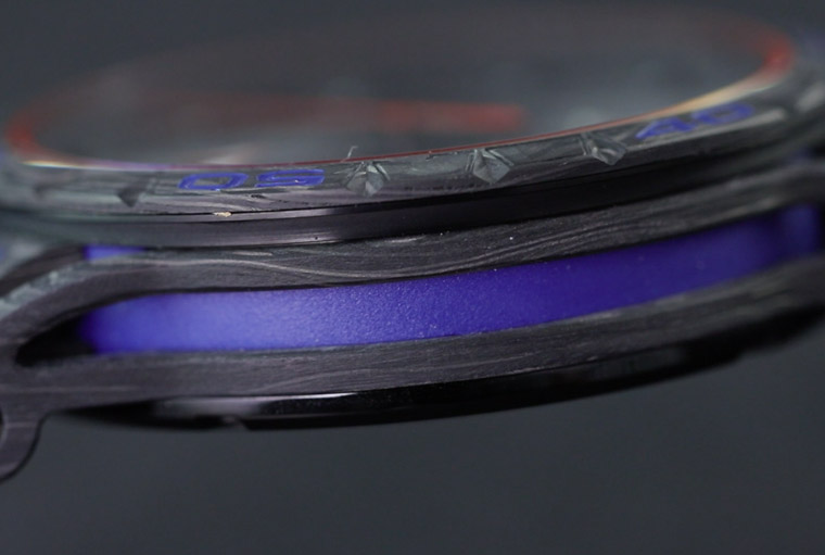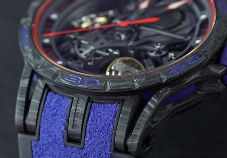 Excalibur Aventador S腕錶從2017年到2018年目前為止推出數款作品,清一色都採用了的碳纖維材質,就像賽車領域為了追求更佳的速度表現而大量導入碳纖維零件息息相關,採用這種科技材質除了表面帶有獨特紋路、帶有堅固保護性之外,車廠看重的就是它的輕量特性——降低車重以提升性能表現;同樣的道理,採用碳纖維外殼的腕錶,雖然不是為了競速,但無論就機芯的保護效果、佩戴在手上的舒適度而言,碳纖維錶殼都有它過人的優勢,尤其考慮到Excalibur系列原本就是以大錶徑和相對厚實的錶身聞名,因此輕量化錶殼有助於減輕佩戴時的負擔感。這款帶有藍色細節的款式,它的碳纖維材質乃是應用所謂的C-SMC(片狀塑模)技術,因此表面呈現不規則紋路,同系列中還有部分款式採用了複層碳纖維技術,其紋路則是呈較規則的水平排列狀。