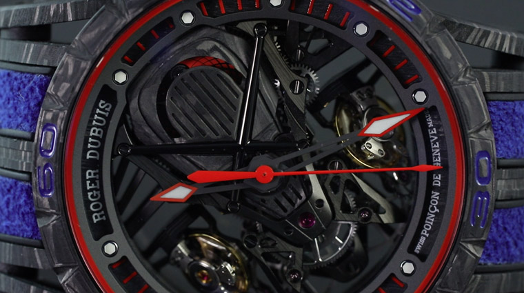 自此以後,Excalibur系列逐漸突顯出它的運動休閒感,影響所及,近兩年羅杰杜彼甚至還與超跑大廠LAMBORGHINI與經典輪胎品牌PIRELLI締結合作關係,更直接了當地將賽車元素引進腕錶設計中,如本次介紹的Excalibur Aventador S腕錶就是目前品牌最新且富有記憶點的Excalibur賽車聯名錶。2017年時品牌已率先發表了兩款Excalibur Aventador S腕錶,這只藍色款式則是到2018年的S.I.H.H.錶展才首次登場,比起前面幾款作品,更大膽熱血的顏色是它給人的第一印象。