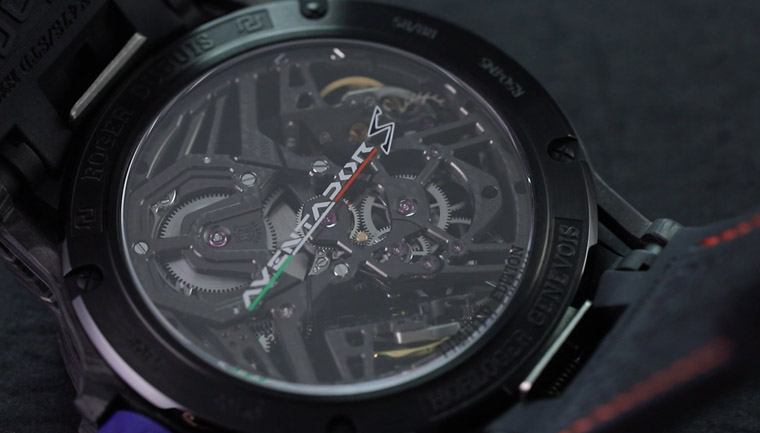 與一般跨界合作的聯名款式相比,ROGER DUBUIS和LAMBORGHINI的雙強攜手可不僅止於改改既有款式的配色和壓壓車廠Logo便交待過去,這個聯名系列每款的發行數量都不多(最少8只,最多88只),加上腕錶身價各個不凡,因此羅杰杜彼可以說是端出了滿滿的誠意來製作。最令人驚嘆之處在於品牌特地為了這款Excalibur Aventador S開發一枚全新機芯——除了外觀部分可從發條盒上方仿造超跑引擎室拉桿設計的機芯橋板嗅出這種「量身打造」的味道,就連功能性上也有新的進展,採用兩枚分別傾斜約45的雙擺輪連動,以促成更精準地走時表現。過往羅杰杜彼曾經先後推出過雙飛行陀飛輪以及四擒縱系統的作品,對於該如何連結、調配複數擒縱系統有著豐富的經驗和技術作為後盾。此次的雙擒縱系統看似未突破過往的技術複雜度,但其實羅杰杜彼首次導入跳秒設計於這枚RD103SQ機芯中,搭配經過差速器連結的雙擒縱系統,每小時可以合力輸出57,600次的震頻,使得秒針跳動的規律更為細膩精準。翻至錶背首先會發現透明底蓋上印有”Aventador S”字樣,接下來機芯的鏤空、打磨修飾也能盡收眼底,並藉由底板上日內瓦印記的佐證,顯示出機芯的品質與性能都通過了嚴格的標準檢驗。