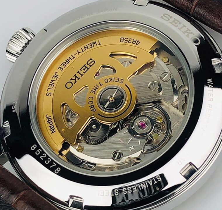 ▲SRPC99J1搭載的4R35機芯具有金色自動盤,從透明底蓋可以一覽機芯的結構。圖片來源:WatchNation