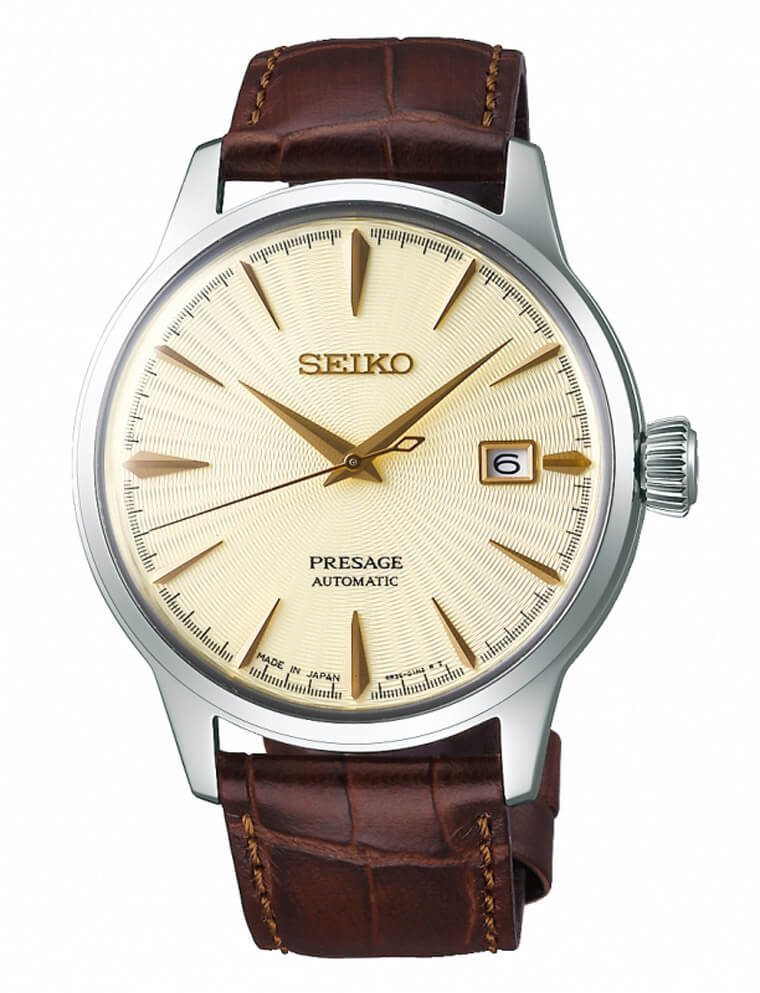 以這次介紹的SRPC99J1為例,它屬於大三針款式,淡金色的面盤讓人聯想起香檳雞尾酒,不鏽鋼錶殼搭配金色調的時標、指針與日期窗框,低調中帶有一點高雅氣質,而且注意到它的面盤細節都有立體切面——這種細膩的做工正是日本錶受人歡迎的原因之一。錶背為透明底蓋,錶款搭載的4R35機芯連自動盤都鍍上金色,讓人看了賞心悅目,它的動力儲存有41小時和上面提到的CITIZEN在伯仲之間,如果每日都有佩戴的話,其實也不太需要煩惱動力儲存很快會耗盡的問題,而且4R35機芯的優點還包含了Magic Lever上鍊機制、游絲以具備高度耐力的Spron合金製成外加品牌特有的Diashock避震系統,別看手錶價位是入門級別,以規格條件來看,這也算是入門機械錶裡面誠意滿檔的配置了。