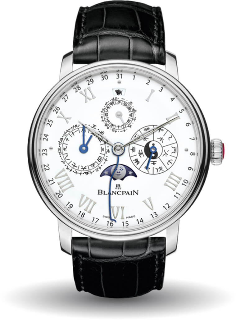 鉑金材質/3638自動上鍊機芯/十二時辰、公曆日期、農曆月份、閏月、十二生肖、天干年份顯示/大明火琺瑯面盤/藍寶石水晶鏡面、透明底蓋/防水30米/錶徑45mm/參考價:約NT$ 2,795,000