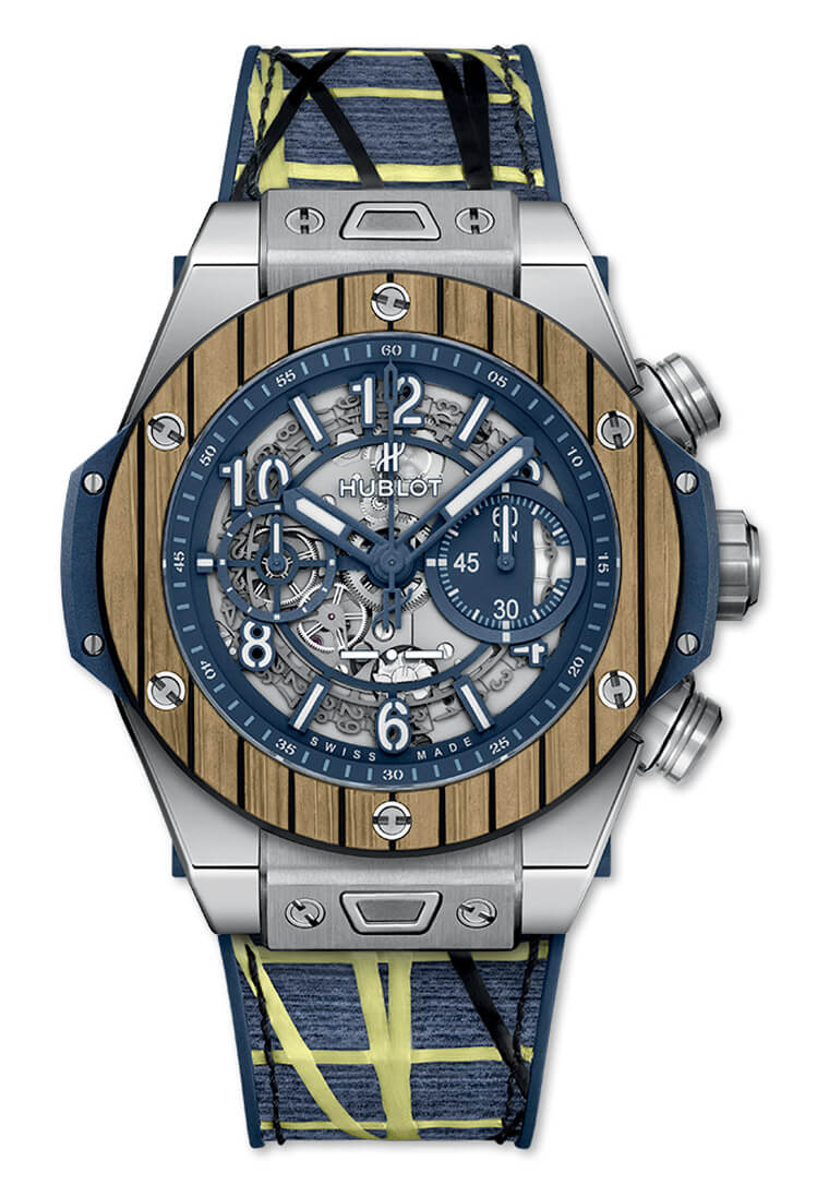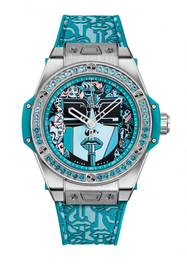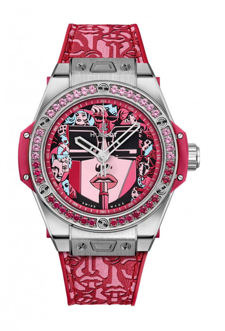 前面提到Orlinski聯名款嘗試採用異色陶瓷這樣的素材,放眼宇舶2019年的新作,材質與材質之間融合的藝術還是他們家的一大專長,例如今年他們推出的Big Bang法拉利車隊創建90週年紀念款中就有陶瓷搭藍寶石水晶錶殼或像改款的Big Bang Unico Italia Independent採用碳纖維加柚木搭鈦金屬,以及Spirit of Big Bang導入了藍色碳纖維材質等等,無論是視覺感受或是觸摸起來的感覺都有別於傳統中規中矩的金屬類材質。此外在女錶方面,品牌也有與藝術家Marc Ferrero合作的Big Bang手錶,面盤上當代藝術風格強烈的畫作,搭配錶圈上鑲嵌的紅色尖晶石或藍色托帕石展現女性既獨立卻也柔情的的多元面向,這款就連錶帶也很有戲,而且還搭配One Click系列,想要自己動手換錶帶十分輕鬆簡單。