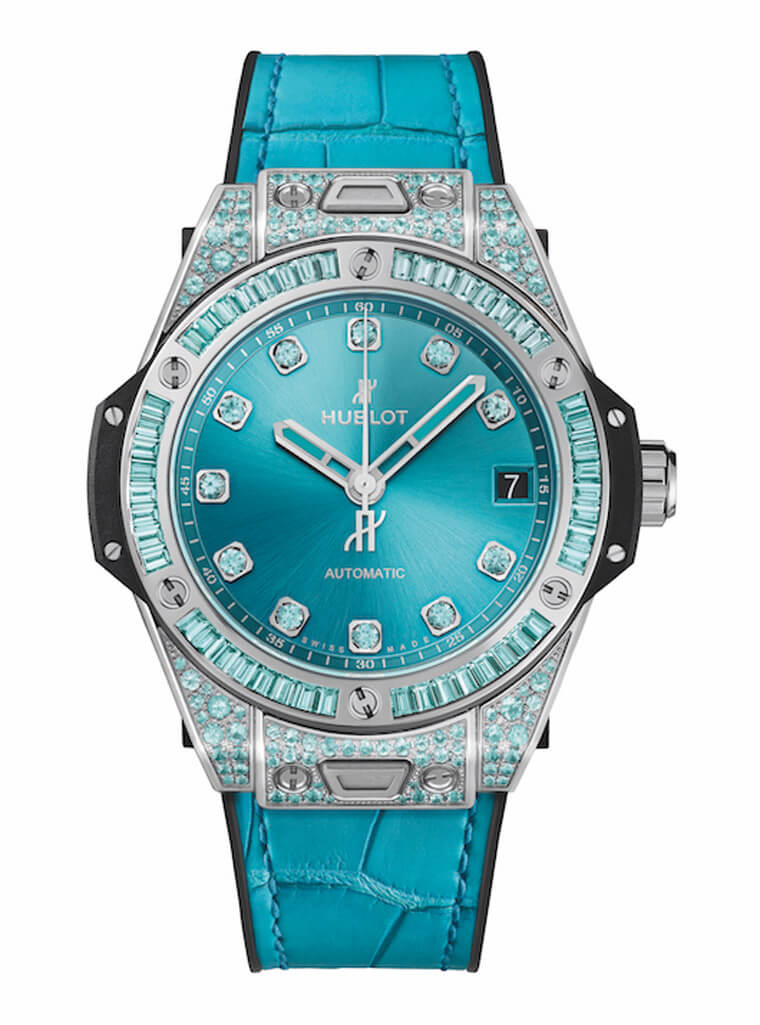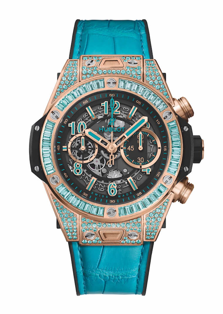 不鏽鋼材質/HUB1710自動上鍊機芯/時、分、秒顯示/錶款鑲42顆藍色托帕石/藍寶石水晶鏡面/防水100米/錶徑39mm/限量50只/參考價:NT$ 537,000